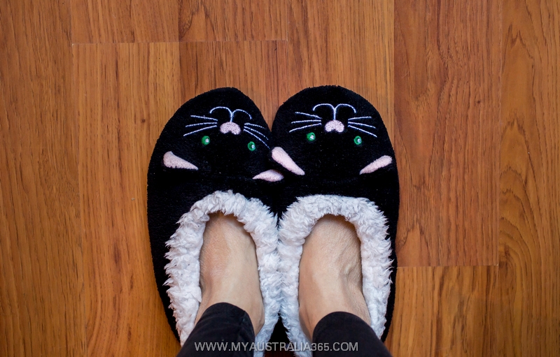 На самом деле в дневное время, когда пригревает солнышко и нет пронизывающего холодного ветра, очень даже тепло. Но стоит скрыться солнышку за горизонтом, как наступает резкий холод. И дома от него нет спасения! Залезать в холодную постель — это целое испытание, но особый челлендж(challenge – сложная задача, проблема) — это выбраться из теплой кроватки утром! Этот год, правда, стал исключением. Мы переехали в дом, где, ура, есть газ и приобрели мощный японский газовый обогреватель Rinnai. Это намного дешевле и эффективнее использования электрического масляного обогревателя. Я даже отказалась от привычных угг дома и завела себе такие веселые домашние тапочки.